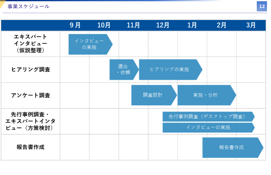 ヒアリング調査、アンケート調査、国内外の先行事例の調査、調査研究報告書の作成