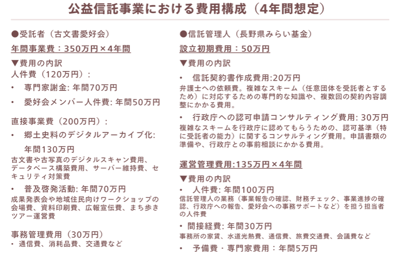 このうち、公益財団法人長野県みらい基金の「◯◯古文書公益信託~歴史・文化の保存と記録」の事業(案)とは