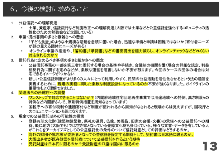 ガイドライン等の作成にあたっての具体的な事業モデルやニーズの把握、制度利用促進に向けた横展開可能なモデル事例の検討を主な目的として、公益信託の事業検討ワークショップが開催されています。