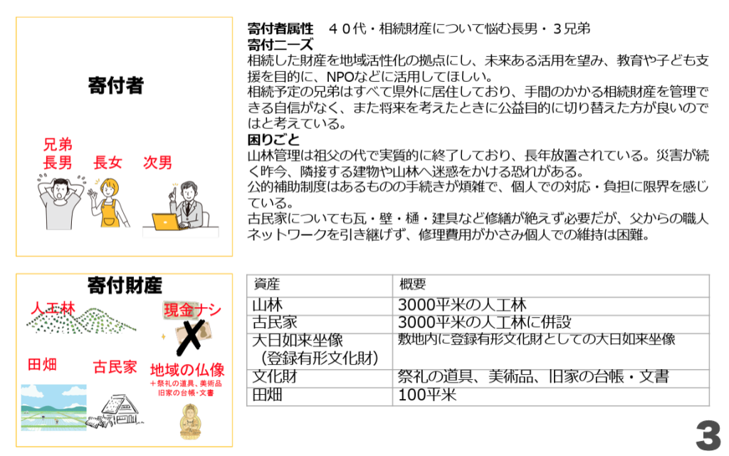 相続財産として承継された歴史的建造物、登録有形文化財、大日如来像、山林、祭礼道具、美術品および古文書等を適切に保存管理し、これを主に不登校児童の教育、子供の健全育成、地域住民の学習および交流の拠点として活用することを目的とします。