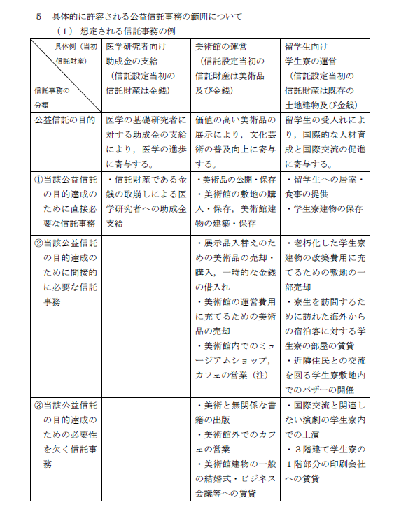 「そして、同表②に位置付けられる信託事務も公益目的のために間接的に必要な信託事務として許容されるべきである。同表②の信託事務に該当するか、同表③の信託事務に該当するかは、公益信託の内容の個別具体的な事情に応じて認定行政庁等が有識者委員会の意見を踏まえて判断するべき性質のものであるが、その運用は、実務における公益信託の申請事務やその後の信託事務の円滑な遂行を阻害することのないように柔軟にされることが望ましいと考えられる。」