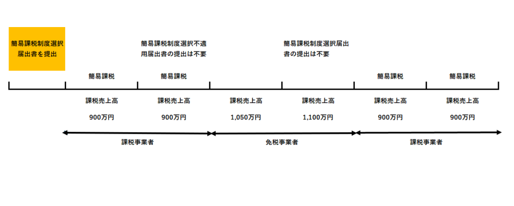 免税事業者となった時点での「簡易課税制度選択不適用届出書」の提出および再び課税事業者となった時点で「簡易課税制度選択届出書」の提出は必要ないと言うことです。