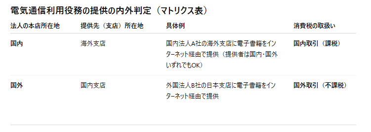 電気通信利用役務の提供が国内において行われたかどうかは、その役務の提供を受ける事業者の本店または主たる事務所が国内にあるかどうかにより判定することとなります