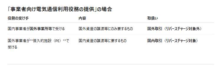 国外事業者が恒久的施設で受ける「事業者向け電気通信利用役務の提供」のうち、国内において行う資産の譲渡等に要するものは国内取引(リバースチャージ方式による申告・納税の対象)となります。