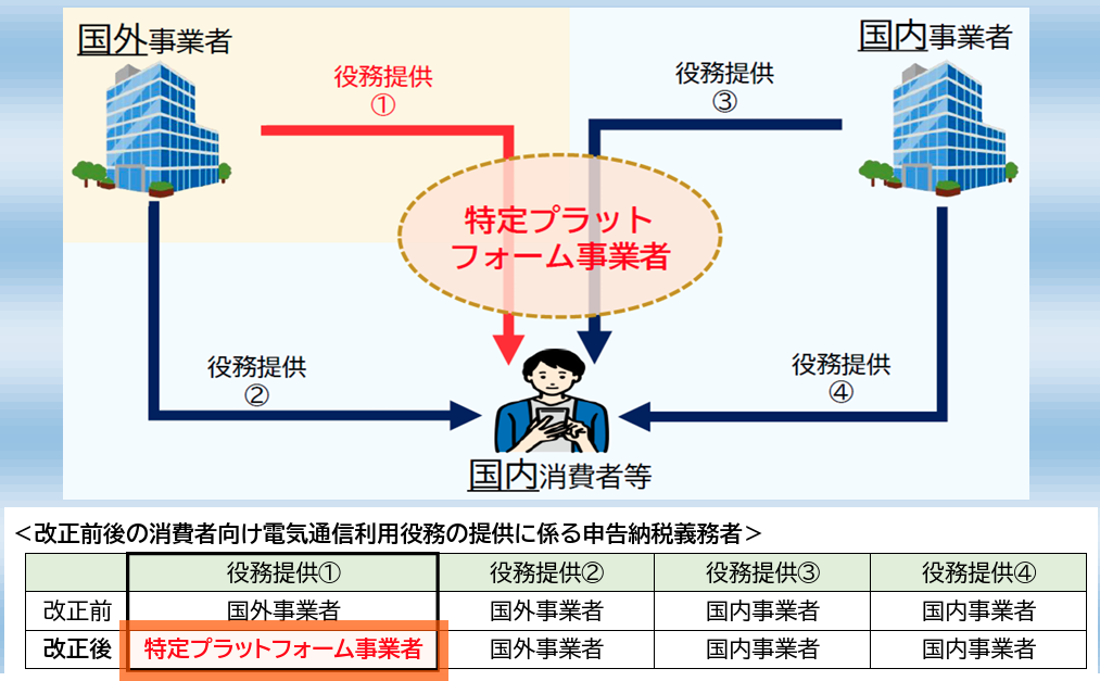 事業者が国内の消費者向けに行うアプリ配信等の「消費者向け電気通信利用役務の提供)については、事業者が国内事業者か国外事業者であるかにかかわらず、その役務提供を行う事業者が申告・納税を行うこととされていました。