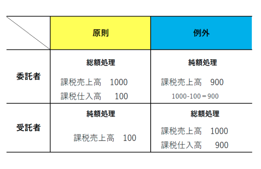 受託者の販売手数料に対して10%の標準税率が適用されますので、委託者側の純額処理と受託者側の総額処理は採用できません。