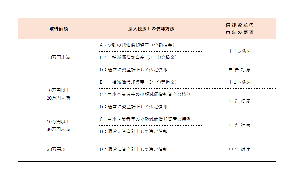 取得価額に対応して「法人税法上の償却方法」と「償却資産税の申告対象の要否」は次のとおりです