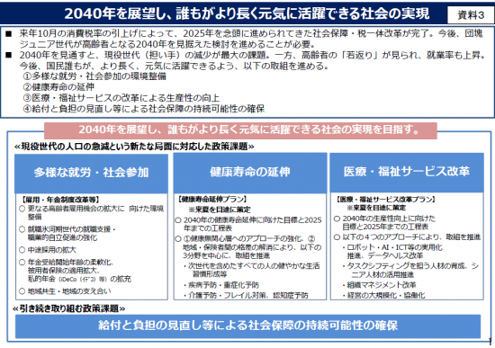 介護人材不足が深刻化するため、①健康寿命の延伸、②医療・福祉サービスの改革、③多様な就労・社会参加の分野で検討が進んでいます。